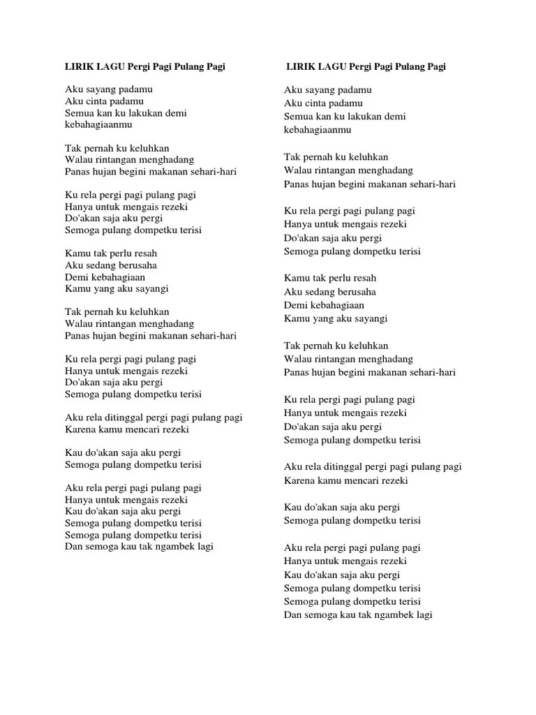 Ku rela pergi pagi pulang pagi. Ku rela pergi pagi pulang pagi hanya untuk mengais rezeki do'akan saja aku pergi. Panas hujan begini ku rela pergi pagi pulang pagi bm e a hanya untuk . Tak pernah ku keluhkan walau rintangan menghadang. F g c am ku rela pergi pagi pulang pagi Dan tentunya juga untuk ikut membumikan lirik lagu yang bersangkutan. Nyanyi pake lirik akhir cerita cinta by glenn fredly yuk! Lirik lagu dari armada, pergi pagi pulang pagi merupakan lagu yang rilis pada 2014, bercerita tentang perjuangan seorang pria. Kurela pergi pagi pulang pagi. Ku rela pergi pagi pulang .